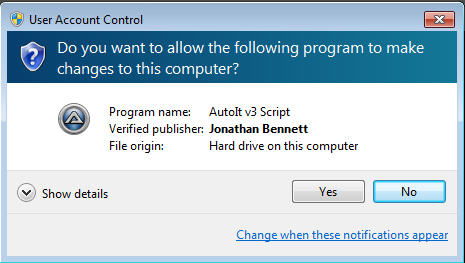 coucou Posted September 14, 2010 Author Posted September 14, 2010 (edited) Hi,If you look at the seial closely, you'll notice that is series of 1234567890...All runing architectures (WinXP, Win7 and AutoIt) are x86. I'm using the latest AutoitIt public release 3.3.6.1. All my scripts was compiled with AutoIt x86.The program does NOT run when I call it from the next run lineRun(@ProgramFilesDir & "\Your Uninstaller 2010\urmain.exe")I added a t the top of the script #RequireAdmin like here bellow#RequireAdmin<BR>Run(@ProgramFilesDir & "\Your Uninstaller 2010\urmain.exe")This time, the program run but still I have a UAC message (see here bellow)Regards Edited September 14, 2010 by coucou