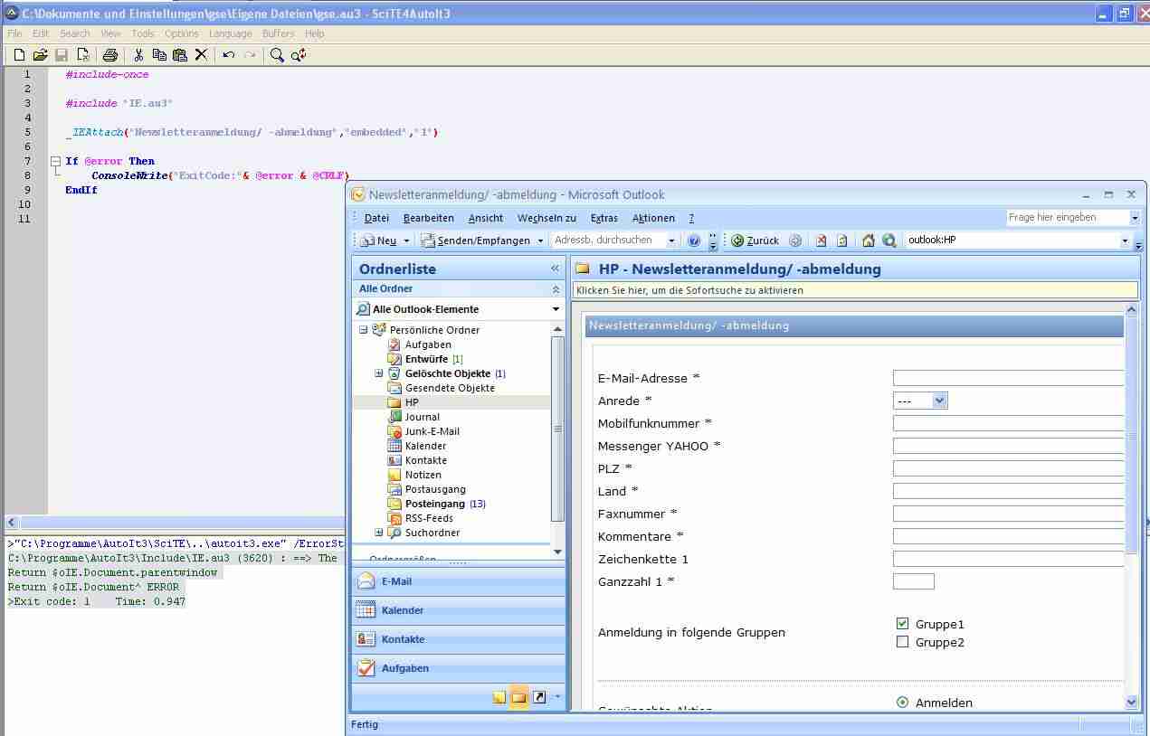 Georg Posted December 28, 2010 Author Posted December 28, 2010 Hi Dale, Thank you for your help. Im using Outlook on Windows XP. - Add an Outlook-Folder. - Go to properties, homepage and set a permanent Homepage http://www.superwebmailer.de/newsletter-software-php-script/defaultnewsletter.php?ML=479&F=1 - Start the script #include-once #include "IE.au3" _IEAttach("Newsletteranmeldung/ -abmeldung","embedded","1") If @error Then ConsoleWrite("ExitCode:"& @error & @CRLF) EndIf Result: C:\Programme\AutoIt3\Include\IE.au3 (3620) : ==> The requested action with this object has failed.: Return $oIE.document.parentwindow Return $oIE.Document^ ERROR >Exit code: 1 Time: 0.947
