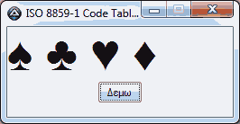 UEZ Posted January 1, 2011 Posted January 1, 2011 (edited) What about this: #include <GUIConstantsEx.au3> $hGUI = GUICreate("ISO 8859-1 Code Table Characters", 250, 100) $label = GUICtrlCreateLabel("♠♣ ♥ ♦", 0, 0, 250, 50) GUICtrlSetFont(-1, 40) $button = GUICtrlCreateButton("Δεμω", 100, 60, 50) GUISetState(@SW_SHOW) While 1 $nMsg = GUIGetMsg() Switch $nMsg Case $GUI_EVENT_CLOSE, $button Exit EndSwitch WEnd Br, UEZ Edited January 2, 2011 by UEZ Please don't send me any personal message and ask for support! I will not reply! Selection of finest graphical examples at Codepen.io The own fart smells best! ✌Her 'sikim hıyar' diyene bir avuç tuz alıp koşma!¯\_(ツ)_/¯ ٩(●̮̮̃•̃)۶ ٩(-̮̮̃-̃)۶ૐ