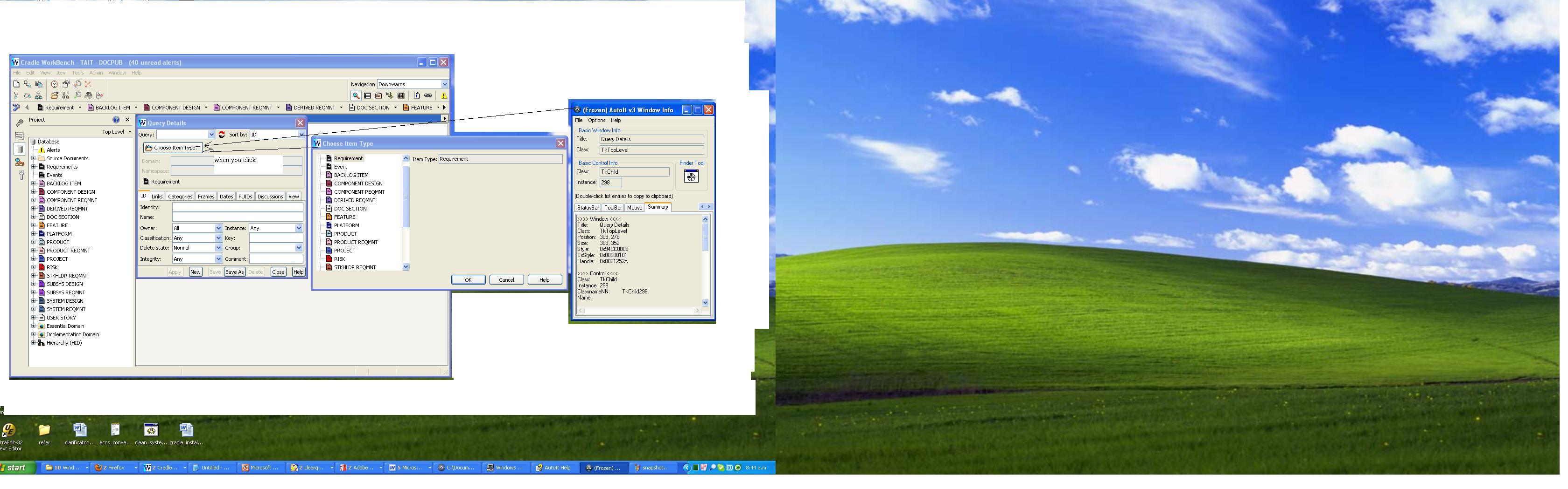 Protocoder Posted May 16, 2011 Author Posted May 16, 2011 (edited) Thank you Shreeks and fett8802. I have enclosed the snapshot. This application main window is on the left, CNTL+F8 Gets the "Query Details" window. I need to click "Choose Item Type" button, and traverse down the list to choose the input the user gives at the command line (example Feature, DERIVED REQMT, etc). Once query type above selected, the second parameter input as provided by the user is the fed as input in the "Identity" item. then press enter. Example: XXYY.exe Feature, FN1231232 So it runs the executable taking first input Feature as "query type" and feeds in "Identity" FN1231232... Hi fett8802, Do you think if i take "_ClickMenu" function, will that help me in this. I will try later today. Any help in above is really appreciated. PS: I have enclosed the Windows Info of the menu item. Thanks and Regards -Protocoder. Edited May 16, 2011 by Protocoder