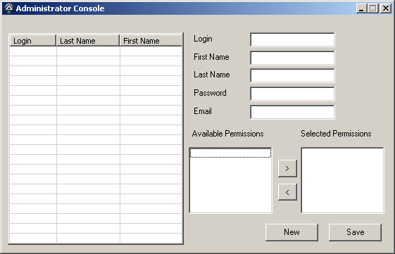 nevodj Posted September 14, 2011 Posted September 14, 2011 Hi Wondering if someone can help a bit of a beginner with some code... or give me some ideas / advice. I'm building a user management console for my app to mange user login details and permissions. The code for the GUI only (no functionality yet) is below with a screen print attached. Basically I need to know the best way to save the data entered and return all the user info to the list box... .ini file or SQL database or....?? You could save a string like: TomS, Tom, Smith, H74G5Df3 (Encrypted password), tom@email.co, Read | Write | Delete | Create | AccessToAdminConsole (String containing permissions) Only problem is i dont know how to save this and return it to the list box and to the edit boxes etc for editing. expandcollapse popup#include <ButtonConstants.au3> #include <EditConstants.au3> #include <GUIConstantsEx.au3> #include <GUIListBox.au3> #include <ListViewConstants.au3> #include <StaticConstants.au3> #include <WindowsConstants.au3> $AdminGui = GUICreate("Administrator Console", 555, 336, -1, -1) $Label1 = GUICtrlCreateLabel("Login", 272, 26, 30, 17) $Label2 = GUICtrlCreateLabel("First Name", 272, 52, 54, 17) $Label3 = GUICtrlCreateLabel("Last Name", 272, 77, 55, 17) $Label4 = GUICtrlCreateLabel("Password", 272, 103, 50, 17) $Label5 = GUICtrlCreateLabel("Email", 272, 129, 29, 17) $Label6 = GUICtrlCreateLabel("Available Permissions", 270, 161, 113, 17) $Label7 = GUICtrlCreateLabel("Selected Permissions", 424, 161, 112, 17) $List2 = GUICtrlCreateList("", 264, 186, 121, 97) GUICtrlSetData(-1, "") $List3 = GUICtrlCreateList("", 423, 186, 121, 97) GUICtrlSetData(-1, "") $Button1 = GUICtrlCreateButton(">", 392, 205, 27, 25, $WS_GROUP) $Button2 = GUICtrlCreateButton("<", 392, 239, 27, 24, $WS_GROUP) $Button3 = GUICtrlCreateButton("Save", 464, 296, 75, 25, $WS_GROUP) $Button3 = GUICtrlCreateButton("New", 374, 296, 75, 25, $WS_GROUP) $Input1 = GUICtrlCreateInput("", 352, 24, 121, 21) $Input2 = GUICtrlCreateInput("", 352, 50, 121, 21) $Input3 = GUICtrlCreateInput("", 352, 75, 121, 21) $Input4 = GUICtrlCreateInput("", 352, 101, 121, 21) $Input5 = GUICtrlCreateInput("", 352, 127, 121, 21) $UserList = GUICtrlCreateListView("Login|Last Name|First Name", 8, 24, 250, 302, Default, $LVS_EX_GRIDLINES) GUICtrlSendMsg(-1, $LVM_SETCOLUMNWIDTH, 0, 66) GUICtrlSendMsg(-1, $LVM_SETCOLUMNWIDTH, 1, 90) GUICtrlSendMsg(-1, $LVM_SETCOLUMNWIDTH, 2, 90) GUISetState(@SW_SHOW) While 1 $Msg = GUIGetMsg() Switch $Msg Case $GUI_EVENT_CLOSE Exit EndSwitch WEnd Appreciate any tips. Thanksadminscreen.bmp