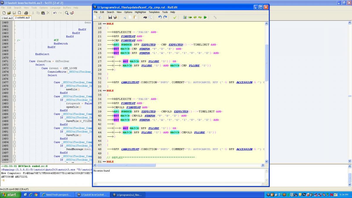 brycetech Posted February 23, 2012 Posted February 23, 2012 HiI implement Hospital Laboratory Information systems. The system we implement has a scripting language that is kind of a black art because there are no tools provided by the vendor which makes it easy to write scripts and verify they are correct. The compiler even missing some of the errors...and you have to upload and compile to use that. Its underutilized and while I write them, advanced scripts are hard to do without aid and lots of trial and error. ...so Ive been writing an editor. I took scintilla and made a new lexer...and have written a nice autoit program that will scan the files for basic proper syntax and I've been using it. But now I'm want to drill down on the details of the individual construction of the script that was written.I need some fresh input on how to perform a check of a function to verify that it is propery formatted. I got a lot of ideas from this topic:With that, I can pull the functions from the script and believe that I can then send them to a different stringregexp expression based on the number of variables that can be in each function.I wrote a regex that will pull all the comments out so I'm not messing with them$array = StringRegExp($string, "(?:[\/]{2}.+[\n])", 3);_ArrayDisplay($array)and I have one that will pull out the items within quotation marks$array = StringRegExp($string, "((?:[match]+^,\x22]|\x22[^\x22]*\x22)+)", 3)_ArrayDisplay($array)when I get all of this done I can pull the functions left with a variation from the link above which I) feel I can script into a loopLocal $aReturn = StringRegExp($string, '(?s)(?i)abs\s*\(\s*((?:.*?|\w+)\s*)\)', 3)_ArrayDisplay($aReturn)for instance will let me display the ABS() function contents.one short example from one of the scripts of code that I'm parsingRULE( CBCND.FINDTEST AND CBCD.FINDTEST AND ABS(NUMBER(CBCND.EXPECTED - CBCD.EXPECTED)) <=TIMELIMIT AND NOT MATCH(CBCD.STATUS,"V","D","X") AND NOT MATCH(CBCND.STATUS,"L","A","T","G","I","V","D","X") AND NOT MATCH(CBCND.PLCODE,"S") AND NOT CBCND.ANYTESTCOM("ORDER_CBCND_S")){ CBCND.CANCELTEST(CONDITION="DUPS", COMMENT="1: AUTOCANCEL CBCND ORDERED WITH CBCD");}which would be assigned to variable $string Local $array= StringRegExp($string, '(?s)(?i)match\s*\(\s*((?:.*?|\w+)\s*)\)', 3)_ArrayDisplay($array)gives me all the contents of the match functions.once all of this is done, I'm a bit lost on what to do with what is left. I need to verify that things are properly joined when needed (with AND, OR, NOT, &, -, +, =, >=, <=, *) and when & is used its a string, AND, NOT,OR is used between functions, and the remainder between numbers unless its =.but I'm still a little confused one how to handle what i get from that. As in the code above, functions can be within functions which complicates things.I'm hoping someone has some suggestions or experience on validating the construction of a function...much like compiling a program would do,but pre-compile.or maybe a function called "match" like this:func match($condition,$item) switch $condition case "" do something case else do something endswitch switch $item case "" do something case else do something endswitchendfuncthat means writing a function for each possible functionor maybe one function which has the function name in the variables that I pass.anyhow, I think I'm making it too complicated and overthinking it.a fresh idea or perspective or direction would be appreciated.TIABT