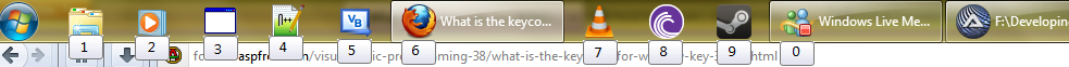 cuddleslapine Posted July 5, 2012 Posted July 5, 2012 Hello everyone! This is my first post in this forum, and that's why i hope that there is no another topic, like this, because i don't want to seem like "oh, here is the new guy...". Sooo... I use AutoIt for... a year or one and a half year, and I've created a lot of useful macros, for instance, I don't have media keys on my keyboard, so i've created an autoit macro which turns some keycombinations into media keys (ctrl + F1 - F7) My new project is a bit same. You know, in Windows 7, there are keyboard shortcuts to launch the pinned applications from the taskbar (WinKey 0 - 9). I'd like to create a simple macro, which shows a small tooltip on my taskbar, at the pinned items, and the text of the tooltips would be the shortcut of that item. Something like this: My first idea was, use fixed locations, but as you can see, if a task is active, it's much wider than the non-active task button. My question is that is there any way, to get the location of the task buttons from the taskbar, OR list the active taskbar buttons? PS.: sorry for my bad english >.<