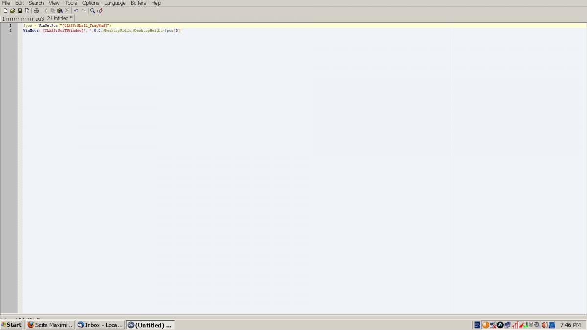 bogQ Posted July 16, 2012 Posted July 16, 2012 (edited) run this in scite and tellme did it help >_< $pos = WinGetPos("[CLASS:Shell_TrayWnd]") WinMove('[CLASS:SciTEWindow]','',0,0,@DesktopWidth,@DesktopHeight-$pos[3]) and i tought youl post full screandshot of your desktop with scite, not just part with buttons but wot the hell run it and tellme did it help Edited July 16, 2012 by bogQ TCP server and client - Learning about TCP servers and clients connectionAu3 oIrrlicht - Irrlicht projectAu3impact - Another 3D DLL game engine for autoit. (3impact 3Drad related) There are those that believe that the perfect heist lies in the preparation.Some say that it’s all in the timing, seizing the right opportunity. Others even say it’s the ability to leave no trace behind, be a ghost.