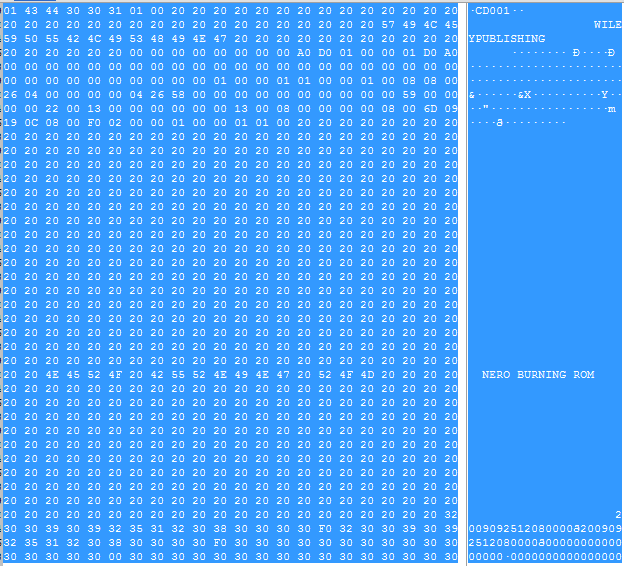 skippynz Posted August 14, 2013 Posted August 14, 2013 Hi everyone, Its been a while since i've been on here but couldnt think of a better place to get answers to my questions I have to try and read in the header information of a CD or DVD in binary. Basically i want to catch the first 880 bytes so i can get some info about the CD without having to open it up in a forensic application. the 880 bytes below will tell me the date that the cd was created, the software used to burn the cd, and the volume name if it has one. If someone can point in the direction of reading in the header i can work out the rest but i got stumped right out the gate. 01 43 44 30 30 31 01 00 20 20 20 20 20 20 20 20 20 20 20 20 20 20 20 20 20 20 20 20 20 20 20 20 20 20 20 20 20 20 20 20 57 49 4C 45 59 50 55 42 4C 49 53 48 49 4E 47 20 20 20 20 20 20 20 20 20 20 20 20 20 20 20 20 20 00 00 00 00 00 00 00 00 A0 D0 01 00 00 01 D0 A0 00 00 00 00 00 00 00 00 00 00 00 00 00 00 00 00 00 00 00 00 00 00 00 00 00 00 00 00 00 00 00 00 01 00 00 01 01 00 00 01 00 08 08 00 26 04 00 00 00 00 04 26 58 00 00 00 00 00 00 00 00 00 00 59 00 00 00 00 22 00 13 00 00 00 00 00 00 13 00 08 00 00 00 00 08 00 6D 09 19 0C 08 00 F0 02 00 00 01 00 00 01 01 00 20 20 20 20 20 20 20 20 20 20 20 20 20 20 20 20 20 20 20 20 20 20 20 20 20 20 20 20 20 20 20 20 20 20 20 20 20 20 20 20 20 20 20 20 20 20 20 20 20 20 20 20 20 20 20 20 20 20 20 20 20 20 20 20 20 20 20 20 20 20 20 20 20 20 20 20 20 20 20 20 20 20 20 20 20 20 20 20 20 20 20 20 20 20 20 20 20 20 20 20 20 20 20 20 20 20 20 20 20 20 20 20 20 20 20 20 20 20 20 20 20 20 20 20 20 20 20 20 20 20 20 20 20 20 20 20 20 20 20 20 20 20 20 20 20 20 20 20 20 20 20 20 20 20 20 20 20 20 20 20 20 20 20 20 20 20 20 20 20 20 20 20 20 20 20 20 20 20 20 20 20 20 20 20 20 20 20 20 20 20 20 20 20 20 20 20 20 20 20 20 20 20 20 20 20 20 20 20 20 20 20 20 20 20 20 20 20 20 20 20 20 20 20 20 20 20 20 20 20 20 20 20 20 20 20 20 20 20 20 20 20 20 20 20 20 20 20 20 20 20 20 20 20 20 20 20 20 20 20 20 20 20 20 20 20 20 20 20 20 20 20 20 20 20 20 20 20 20 20 20 20 20 20 20 20 20 20 20 20 20 20 20 20 20 20 20 20 20 20 20 20 20 20 20 20 20 20 20 20 20 20 20 20 20 20 20 20 20 20 20 20 20 20 20 20 20 20 20 20 20 20 20 20 20 20 20 20 20 20 20 20 20 20 20 20 20 20 20 20 20 20 20 20 20 20 20 20 20 20 20 20 20 20 20 20 20 20 20 20 20 20 20 20 20 20 20 20 20 20 20 20 20 20 20 4E 45 52 4F 20 42 55 52 4E 49 4E 47 20 52 4F 4D 20 20 20 20 20 20 20 20 20 20 20 20 20 20 20 20 20 20 20 20 20 20 20 20 20 20 20 20 20 20 20 20 20 20 20 20 20 20 20 20 20 20 20 20 20 20 20 20 20 20 20 20 20 20 20 20 20 20 20 20 20 20 20 20 20 20 20 20 20 20 20 20 20 20 20 20 20 20 20 20 20 20 20 20 20 20 20 20 20 20 20 20 20 20 20 20 20 20 20 20 20 20 20 20 20 20 20 20 20 20 20 20 20 20 20 20 20 20 20 20 20 20 20 20 20 20 20 20 20 20 20 20 20 20 20 20 20 20 20 20 20 20 20 20 20 20 20 20 20 20 20 20 20 20 20 20 20 20 20 20 20 20 20 20 20 20 20 20 20 20 20 20 20 20 20 20 20 20 20 20 20 20 20 20 20 20 20 20 20 20 20 20 20 20 20 20 20 20 20 20 20 20 20 20 20 20 20 20 20 20 20 20 20 20 20 20 20 20 20 20 20 20 20 32 30 30 39 30 39 32 35 31 32 30 38 30 30 30 30 F0 32 30 30 39 30 39 32 35 31 32 30 3830 30 30 30 30 00 30 30 30 30 30 30 30 30 30 30 30 30 30 30 30 30 PS im dont want anyone to write the script for me just a gentle nudge in the right direction would be great. Cheers Skip