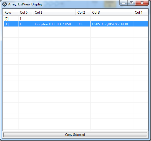 LyndaSing7 Posted December 12, 2013 Posted December 12, 2013 (edited) For example, I would like to copy the only column 3 from the hardwareID column, may I know what method that is suitable to be use? below is my code, #include <Array.au3> $USB = USBDevices() If IsArray($USB) Then _ArrayDisplay($USB) Func USBDevices() Local $USB $ComputerName = "." $wmiServices = ObjGet("winmgmts:{impersonationLevel=Impersonate}!//" & $ComputerName) $wmiDiskDrives = $wmiServices.ExecQuery("SELECT Model, InterfaceType, PNPDeviceID, Caption, DeviceID, SerialNumber FROM Win32_DiskDrive") Local $USB[1][5] For $wmiDiskDrive In $wmiDiskDrives $wmiDiskPartitions = $wmiServices.ExecQuery("ASSOCIATORS OF {Win32_DiskDrive.DeviceID='" & $wmiDiskDrive.DeviceID & "'} WHERE AssocClass = Win32_DiskDriveToDiskPartition") For $wmiDiskPartition In $wmiDiskPartitions $wmiLogicalDisks = $wmiServices.ExecQuery("ASSOCIATORS OF {Win32_DiskPartition.DeviceID='" & $wmiDiskPartition.DeviceID & "'} WHERE AssocClass = Win32_LogicalDiskToPartition") For $wmiLogicalDisk In $wmiLogicalDisks If $wmiDiskDrive.InterfaceType = 'USB' Then $USB[0][0] += 1 ReDim $USB[$USB[0][0]+1][5] $USB[$USB[0][0]][0] = $wmiLogicalDisk.DeviceID $USB[$USB[0][0]][1] = $wmiDiskDrive.Model $USB[$USB[0][0]][2] = $wmiDiskDrive.InterfaceType $USB[$USB[0][0]][3] = $wmiDiskDrive.PNPDeviceID $USB[$USB[0][0]][4] = $wmiDiskDrive.SerialNumber EndIf Next Next Next Return $USB EndFunc thank you and appreciate if any able to help ^^ Edited December 13, 2013 by LyndaSing7