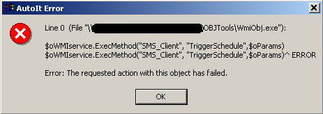 seandisanti Posted September 13, 2005 Posted September 13, 2005 Thanks but it did not work, I am attaching the code, when it fails it displays the line.$sScheduleID = "{00000000-0000-0000-0000-000000000001}" $oWMIservice = ObjGet("winmgmts:\\" & $MyCompName & "/root/ccm") if @error = 0 then $oInstance = $oWMIservice.Get("SMS_Client") if @error = 0 then $oParams = $oInstance.Methods_("TriggerSchedule").inParameters.SpawnInstance_() if @error = 0 then $oParams.sScheduleID = $sScheduleID if @error = 0 then $oWMIservice.ExecMethod("SMS_Client", "TriggerSchedule",$oParams) if @error = 0 Then Exit Else Exit(1) EndIf EndIf EndIf EndIf EndIf Exit(1)<{POST_SNAPBACK}>what line is being displayed? could you take a screenshot of the error message? it may not be one that is generated by autoit