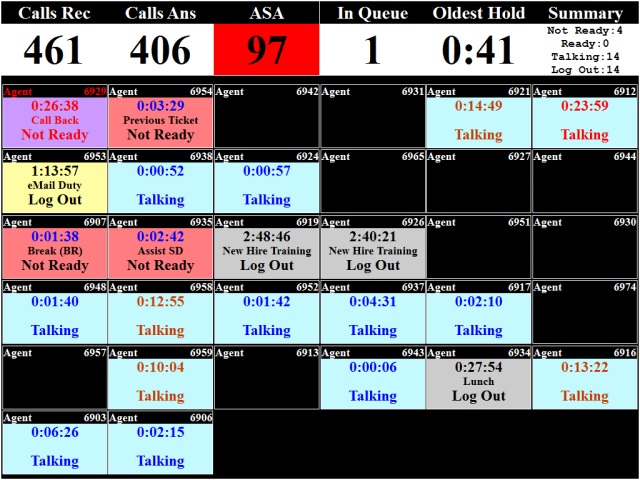 SlowCoder74 Posted February 18, 2014 Author Posted February 18, 2014 If you create the controls, you have a way of keeping track of where they are when you create them. Dynamically or not, you have to tell the interpreter where to put them at some point in your script. I guess I'll put it this way. The positions and sizes are calculated dynamically during creation, based on the number of agents, text size, etc. I did not consciously decide the specific locations of each, other than to build the calculation algorithm. So, yes, the locations are "known", but not necessarily stored in any variables within my app. After the labels have been created, sized and placed, only the text and colors have to be updated as the new wallboard information is retrieved. If you're interested, I've attached an image of the wallboard. The columns and rows can be configured, as well as font, font size, etc. Everything is dynamic.