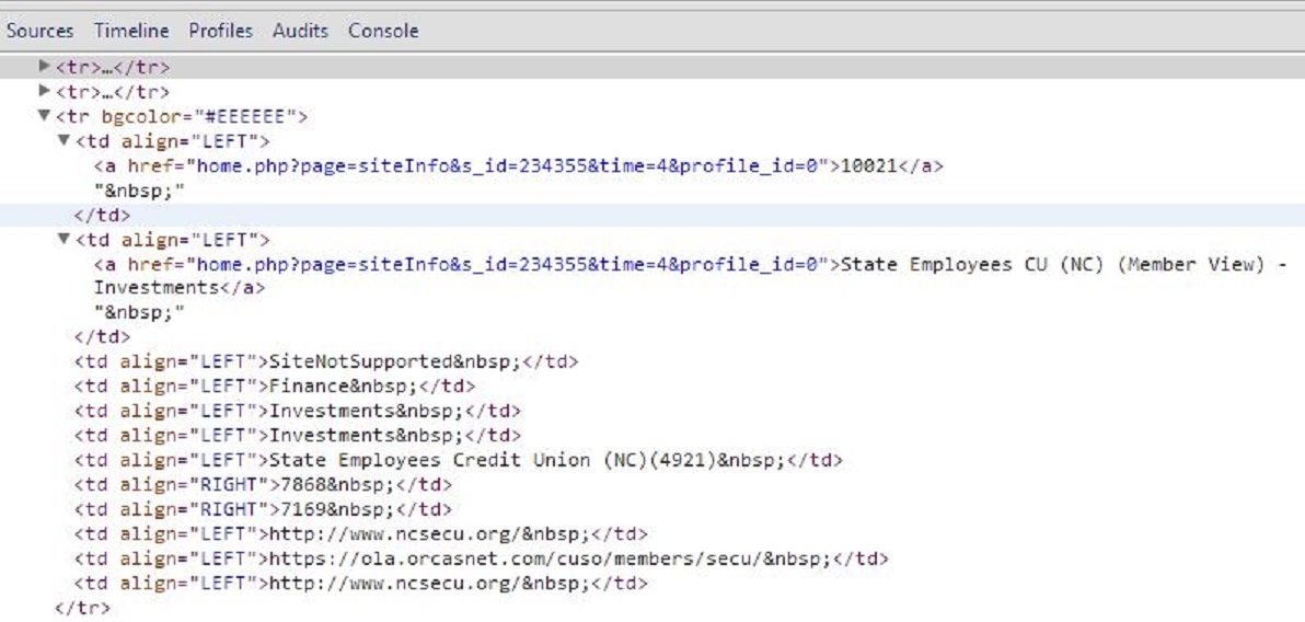 sammy1983 Posted March 29, 2014 Posted March 29, 2014 Hi, Please look at the screenshot taken from the internal tool source code. I am trying to extract "Investments" from the below source code. <td align="LEFT">Investments </td> Below is my code: $sHTML = _IEDocReadHTML($oIE1) $array = StringRegExp($sHTML, '(?i)">(.*?)</(?i)td>', 3) For $a = 0 To UBound($array) - 1 $Date = $array[$a] MsgBox(0, "", $Date) Next but the above code extracts just "10021" and then "State Employees CU (NC) (Member View) - Investments" and then moves to the second row in the table without moving to the next element. It seems that because <td>... </td> is closed script is not moving to next element.