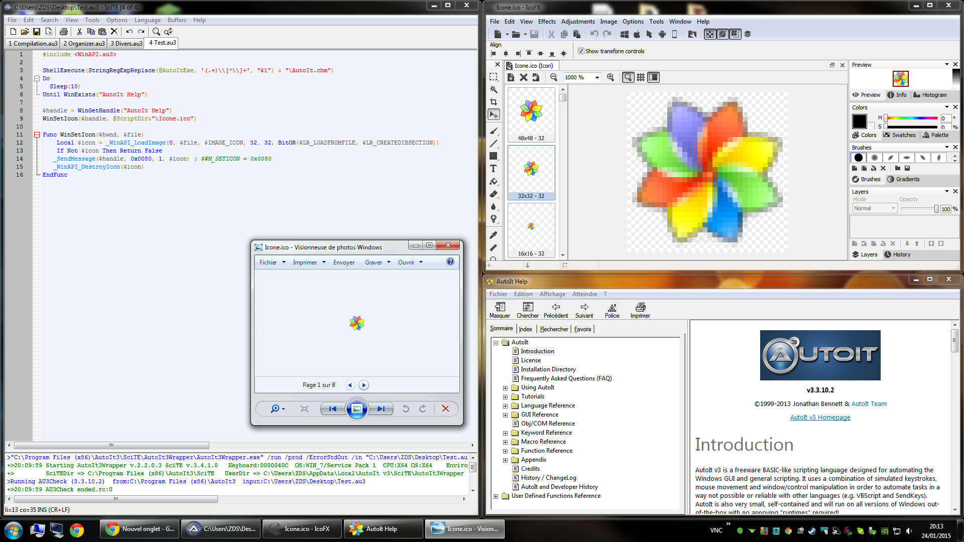 ZDS Posted March 26, 2015 Author Posted March 26, 2015 (edited) I think you missed the problem : The icon in the taskbar at the bottom of the screen is pixellated (but when I create a GUI with GUICreate and GUISetIcon, there is not pixellisation; only when I set a new icon on a not-AutoIt window). Please zoom in to see properly the icon issue : Edited March 26, 2015 by ZDS