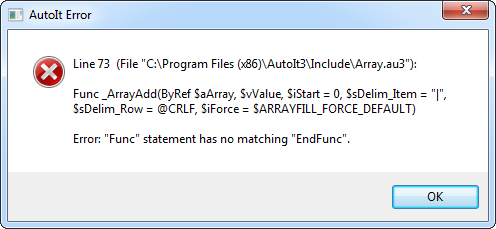 spudw2k Posted April 6, 2017 Posted April 6, 2017 (edited) The error makes me believe that something prior to this line is the cause. Since that line start with Func, something before that line is causing the issue. Can you share more of the script? Also, did you extract functions from the Array.au3 UDF, or are you just including it. Scratch, that....I'm willing to wager you are including it..._Array_Add is the first function in the UDF. We need more info to go on. I use the Array.au3 UDF all of the time and never have this issue, so it must be something inherit with the rest of your script. Edited April 6, 2017 by spudw2k Spoiler Things I've Made: Always On Top Tool ◊ AU History ◊ Deck of Cards ◊ HideIt ◊ ICU ◊ Icon Freezer ◊ Ipod Ejector ◊ Junos Configuration Explorer ◊ Link Downloader ◊ MD5 Folder Enumerator ◊ PassGen ◊ Ping Tool ◊ Quick NIC ◊ Read OCR ◊ RemoteIT ◊ SchTasksGui ◊ SpyCam ◊ System Scan Report Tool ◊ System UpTime ◊ Transparency Machine ◊ VMWare ESX Builder Misc Code Snippets: ADODB Example ◊ CheckHover ◊ Detect SafeMode ◊ DynEnumArray ◊ GetNetStatData ◊ HashArray ◊ IsBetweenDates ◊ Local Admins ◊ Make Choice ◊ Recursive File List ◊ Remove Sizebox Style ◊ Retrieve PNPDeviceID ◊ Retrieve SysListView32 Contents ◊ Set IE Homepage ◊ Tickle Expired Password ◊ Transpose Array Projects: Drive Space Usage GUI ◊ LEDkIT ◊ Plasma_kIt ◊ Scan Engine Builder ◊ SpeeDBurner ◊ SubnetCalc Cool Stuff: AutoItObject UDF ◊ Extract Icon From Proc ◊ GuiCtrlFontRotate ◊ Hex Edit Funcs ◊ Run binary ◊ Service_UDF
