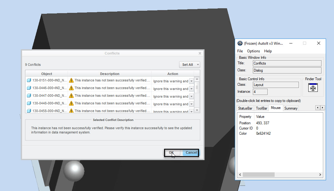 Rmedina4 Posted July 20, 2017 Author Posted July 20, 2017 expandcollapse popup#include <File.au3> #include <Array.au3> #include <MsgBoxConstants.au3> #RequireAdmin AutoItSetOption('MouseCoordMode', 0) AutoItSetOption('SendKeyDelay', 7) Global $sParts = @ScriptDir & "\connectors-prt.txt" ;~ String Variable pointing to Parts.txt file Global $aParts ;~ Array Variable _FileReadToArray($sParts, $aParts) $log = Fileopen(@scriptdir & "\log.txt", 10) For $i = 1 To $aParts[0] FileWrite($log, $aParts[$i]) WinWait("Creo Parametric") WinActivate("Creo Parametric") sleep(5000) MouseClick('primary', 1300, 292, 1, 0) ;**************************************************************************************** ;This part of the code is for assigning a var to a part ;it stores the var then paste it into the search field and hits enter ; ;**************************************************************************************** ClipPut($aParts[$i]) Send('^v') Sleep(2000) Send("{ENTER}") ;;;;;;;;;;;;;;;;;;;;;;;;;;;;;;;;;;;;;;;;;;;;;;;;;;;;;;;;;;;;;;;;;;;;;;;;;;;;;;;;;;;;; ; This part of the code executes in PDP and will show the results of ; the ClipPut ("Value") and will show the part in PDP ; ;;;;;;;;;;;;;;;;;;;;;;;;;;;;;;;;;;;;;;;;;;;;;;;;;;;;;;;;;;;;;;;;;;;;;;;;;;;;;;;;;;;;; sleep(9000) WinWait("Creo Parametric") WinActivate("Creo Parametric") MouseClick('Secondary', 415, 603, 1, 0) sleep(3000) Send('{DOWN}') sleep(1000) Send('{DOWN}') Send('{RIGHT}') sleep(3000) Send("{ENTER}") Information() Sleep (5000) ;;;;;;;;;;;;;;;;;;;;;;;;;;;;;;;;;;;;;;;;;;;;;;;;;;;;;;;;;;;;;;;;;;;;;;;;;;;;;;;;;;;;; ; This part of the code executes when select instance window comes up ;;;;;;;;;;;;;;;;;;;;;;;;;;;;;;;;;;;;;;;;;;;;;;;;;;;;;;;;;;;;;;;;;;;;;;;;;;;;;;;;;;;;; WinWait("Select Instance") WinActivate("Select Instance") Send("{ENTER}") Sleep(9000) ;;;;;;;;;;;;;;;;;;;;;;;;;;;;;;;;;;;;;;;;;;;;;;;;;;;;;;;;;;;;;;;;;;;;;;;;;;;;;;;;;;;;; ; This part of the code executes in Creo and will click on the X button To ; Close the current window another way to do this is WinClose funtion ; ;;;;;;;;;;;;;;;;;;;;;;;;;;;;;;;;;;;;;;;;;;;;;;;;;;;;;;;;;;;;;;;;;;;;;;;;;;;;;;;;;;;;; WinWaitActive("[CLASS:Dialog]") Send("uf") MenuManager () sleep(5000) WinWait("[CLASS:Dialog]") WinActivate ("[CLASS:Dialog]") MouseClick('Primary', 610, 84, 1, 0) Sleep(9000) Send('{DOWN 4}') Sleep(9000) Send("{ENTER}") WinWaitActive("Parameter Status",'') Send("{ENTER}") WinWaitActive("Parameter Status",'') Send("{ENTER}") Sleep(9000) WinWait("[CLASS:Dialog]") WinActivate ("[CLASS:Dialog]") ;;;;;;;;;;;;;;;;;;;;;;;;;;;;;;;;;;;;;;;;;;;;;;;;;;;;;;;;;;;;;;;;;;;;;;;;;;;;;;;;;;;;;;;;;;;;;;;;;;;;;;;;;;;;;;;;;;;;;;;;;;;;;;;;;;;;;;;;;;;;;;; ; This part of the code executes in Creo and bring back the PDP search link ; Make sure to have MapKey created in Creo call it qq so when its called ; it will close the object in creo ; ; Another Mapkey that needs to be created is ss so it can bring up the PDP search ; site. ;;;;;;;;;;;;;;;;;;;;;;;;;;;;;;;;;;;;;;;;;;;;;;;;;;;;;;;;;;;;;;;;;;;;;;;;;;;;;;;;;;;;;;;;;;;;;;;;;;;;;;;;;;;;;;;;;;;;;;;;;;;;;;;;;;;;;;;;;;;;;;;;;;; #comments-start This part of the script locates the Tools in Creo and clicks on Family Table #comments-end MouseClick('Primary', 610, 84, 1, 0) Sleep(5000) Send('{DOWN 4}') Sleep(5000) Send("{ENTER}") WinWaitActive("Parameter Status",'') Send("{ENTER}") WinWaitActive("Parameter Status",'') Send("{ENTER}") Sleep(5000) WinWait("[CLASS:Dialog]") WinActivate ("[CLASS:Dialog]") Send("dftt") ; nv tool tab WinWaitActive("[CLASS:Dialog]") MouseClick('Primary', 122, 53, 1, 0) Sleep(5000) ; this part is for the "Generate family table Columns" WinWaitActive("[CLASS:Dialog]") MouseClick('Primary', 610, 84, 1, 0) Sleep(5000) Send('{DOWN}') Sleep(5000) Send("{ENTER}") Sleep(5000) ; This part clicks on the manu load feature WinWaitActive("[CLASS:Dialog]") MouseClick('Primary', 610, 84, 1, 0) Sleep(5000) Send('{DOWN}') Send('{DOWN}') Send('{DOWN}') Sleep(5000) Send("{ENTER}") ; popup window after you click on the manu load button WinWait("Information") WinActivate("Information") Send("{ENTER}") ; in the search field it will enter the part.txt file and press enter WinWait("Select File") WinActivate("Select File") Send (StringTrimRight($aParts[$i], 4) &".txt") Sleep(5000) Send('{ENTER}') ; the status will appear and a dialog box will appear, click enter WinWait("Family Table Status") WinActivate("Family Table Status") Sleep(5000) Send ('{ENTER}') Sleep(5000) ;After the manu process is complete WinWaitActive("Information") Sleep(5000) Send("{ENTER}") Sleep (5000) WinWaitActive("[CLASS:Dialog]") Send("viv") ;Send ("vinst") ;Send("{CTRLDOWN}s{CTRLUP}") ;close object window ;;;;;;;;;;;;;;;;;;;;;;;;;;;;;;;;;;;;;;;;;;;;;;;;;;;;;;;;;;;;;;;;;;;;;;;;;;;;;;;;;;;;; ; This part of the code executes a if else function for things to be verify if needed ;;;;;;;;;;;;;;;;;;;;;;;;;;;;;;;;;;;;;;;;;;;;;;;;;;;;;;;;;;;;;;;;;;;;;;;;;;;;;;;;;;;;; ;Conflicts() ;Sleep(3000) ;;;;;;;;;;;;;;;;;;;;;;;;;;;;;;;;;;;;;;;;;;;;;;;;;;;;;;;;;;;;;;;;;;;;;;;;;;;;;;;;;;;;; ; This part of the code executes a Creo HotKey to quit object ;;;;;;;;;;;;;;;;;;;;;;;;;;;;;;;;;;;;;;;;;;;;;;;;;;;;;;;;;;;;;;;;;;;;;;;;;;;;;;;;;;;;; ;WinWaitActive("[CLASS:Dialog]") ;Send("qq") Sleep(5000) ;;;;;;;;;;;;;;;;;;;;;;;;;;;;;;;;;;;;;;;;;;;;;;;;;;;;;;;;;;;;;;;;;;;;;;;;;;;;;;;;;;;;; ; This part of the code executes a Creo HotKey open up the PDP search window ;;;;;;;;;;;;;;;;;;;;;;;;;;;;;;;;;;;;;;;;;;;;;;;;;;;;;;;;;;;;;;;;;;;;;;;;;;;;;;;;;;;;; WinWaitActive("[CLASS:Dialog]") Send("ss") FileWrite($log, @CRLF) Next FileClose($log) Func Information () If WinActivate ("Information") Then Send("{ENTER}") Else EndIf EndFunc Func MenuManager () If WinActivate ("Menu Manager") Then MouseClick('Primary', 66, 53, 1, 0) Sleep(2000) MouseClick('Primary', 55, 192, 1, 0) WinWaitActive("[CLASS:Dialog]") Send("qq") WinWaitActive("[CLASS:Dialog]") Send("ss") Next Else EndIf EndFunc is there anyway to create a function and in th