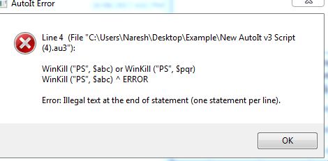 alienclone Posted August 27, 2017 Posted August 27, 2017 are you running your script in the SciTE editor? it should tell you where a problem in a script is. when i tried to run your script in SciTE it gave errors directly in script... $abc = ("Done:2: See logs for more details.") $pqr = ("Msg:2.2: (Save) :- Server was unable to process request.") Winkill ("PS", $abc) or ("PS", $pqr) error: unbalanced paranthesis expression. error: syntax error error: Statement cannot be just an expression. it also shows where the halt is in the console readout at bottom of editor, indicated by the "^" below the line of code... "C:\Users\alienclone\New AutoIt v3 Script.au3"(8,30) : error: unbalanced paranthesis expression. Winkill ("PS", $abc) or ("PS", ~~~~~~~~~~~~~~~~~~~~~~~~~~~~~^ "C:\Users\alienclone\New AutoIt v3 Script.au3"(8,30) : error: syntax error Winkill ("PS", $abc) or ("PS", ~~~~~~~~~~~~~~~~~~~~~~~~~~~~~^ "C:\Users\alienclone\New AutoIt v3 Script.au3"(8,32) : error: Statement cannot be just an expression. Winkill ("PS", $abc) or ("PS", $pqr ~~~~~~~~~~~~~~~~~~~~~~~~~~~~~~~^ "C:\Users\alienclone\New AutoIt v3 Script.au3"(8,37) : error: Statement cannot be just an expression. Winkill ("PS", $abc) or ("PS", $pqr) ~~~~~~~~~~~~~~~~~~~~~~~~~~~~~~~~~~~~^ C:\Users\alienclone\New AutoIt v3 Script.au3 - 4 error(s), 0 warning(s) If @error Then MsgBox(262192, "", @ComputerName & " slaps " & @UserName & " around a bit with a large trout!") EndIf "Yeah yeah yeah patience, how long will that take?" -Ed Gruberman REAL search results | SciTE4AutoIt3 Editor Full Version