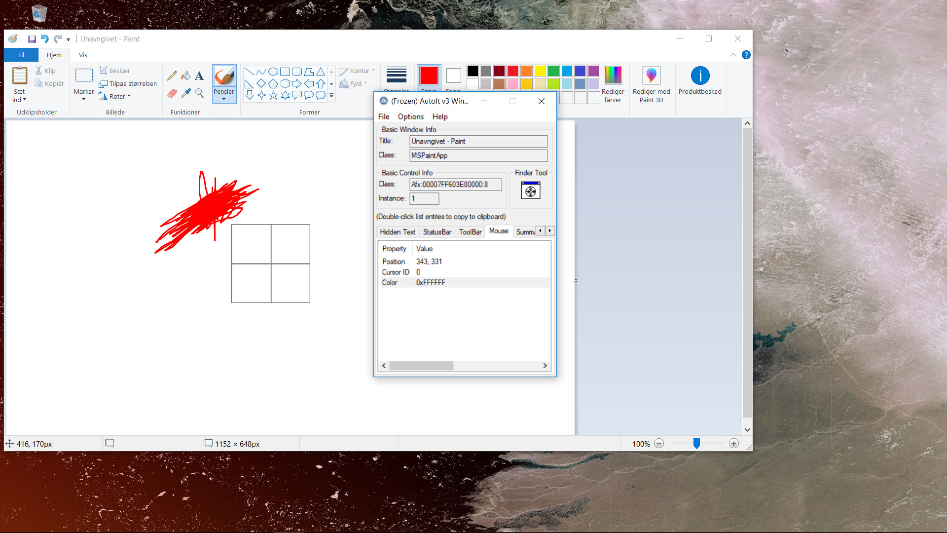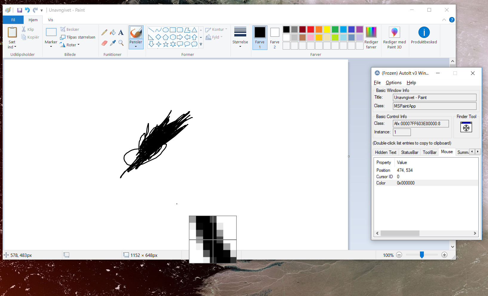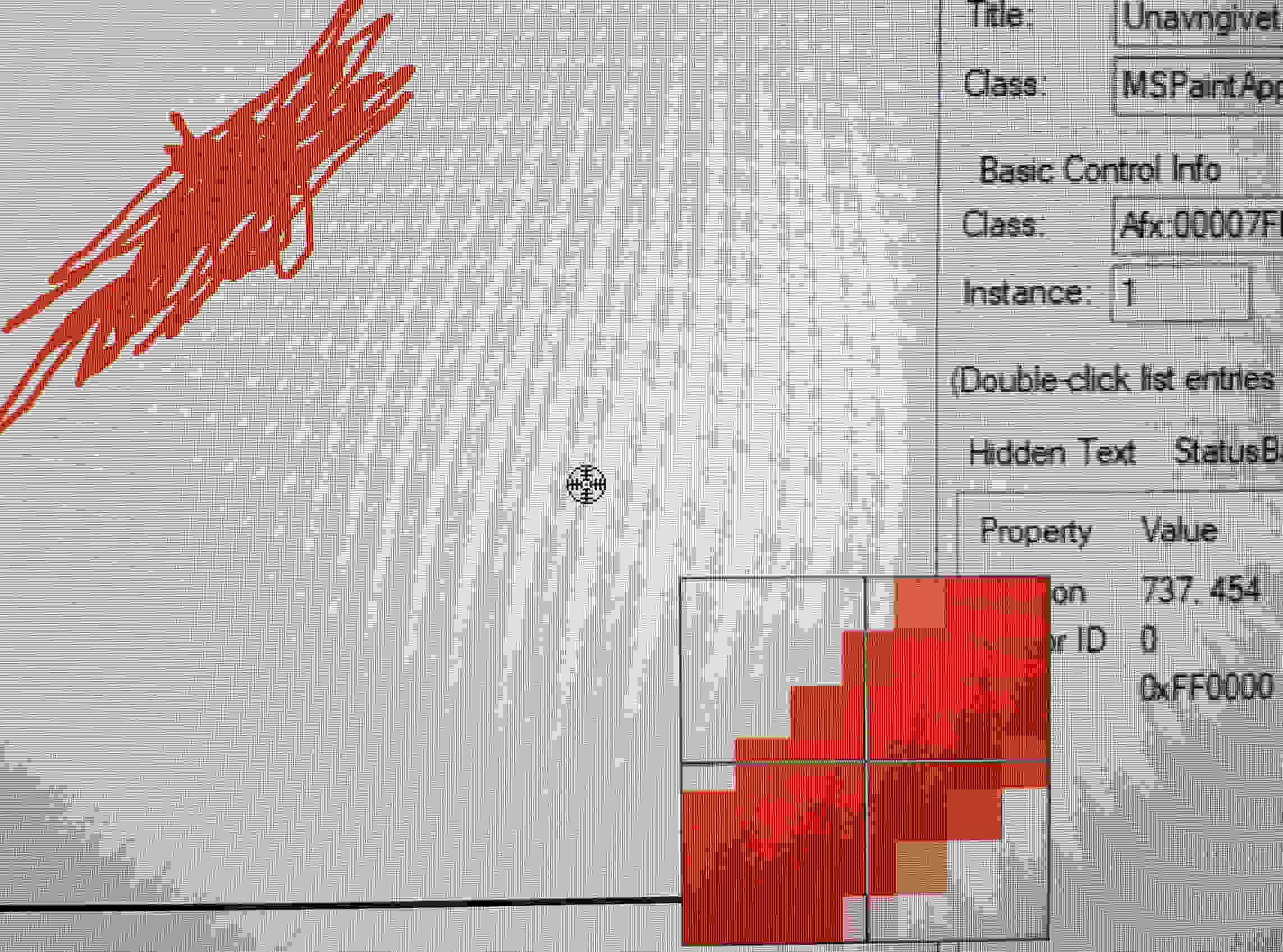 hook Posted October 11, 2018 Author Posted October 11, 2018 Ok Im sorry I started out bad here, but I also met some answers which seemed not correct... Ofc The Au3Info can pick color as value which is what I intended for using some pixel search, but that is a totally other discussion... Here I just want to make clear what I say, an error or not, I need to get it correct... I can't make it correct with choosing screen/window/client in options... What I say is the mouse point dosen't show the color of where it is placed... See here the first image mouse is located on the red, but the Info program says (ffffff) which is white The second image it shows the red (ff0000) which is the red BUT the mouse location is not on the red paintings... (I by luck located the red off to the point where it should have been)... SO if not a bug, then what? (please note I tested the screen/window/client option too)