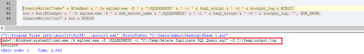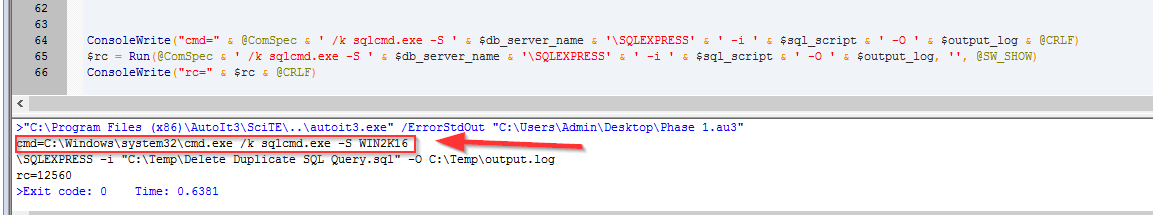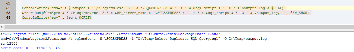 cesinha87 Posted August 14, 2019 Posted August 14, 2019 Hello everyone, I am very new to AUTOIT and I am almost done with my script and I am having a hard time with the Run function....When I run the command locally in the CMD it works but when I run through the AUTOIT it doesn't Note: sqlcmd.exe command is available in the system where I am running the AutoIt Editor I've seen before here and I can't figure out. I am trying to write the final command in the Output tab (where the arrow is) to make sure the command and variables are passing correctly using CONSOLEWRITE and I am not able to do that. I tried MSGBOX as well $command = Run (@ComSpec & " /c " & 'sqlcmd.exe' & ' -S ' & $db_server_name & '\SQLEXPRESS' & ' -i ' & $sql_script & ' -O ' & $output_log, '', @SW_HIDE) ConsoleWrite ($command)
