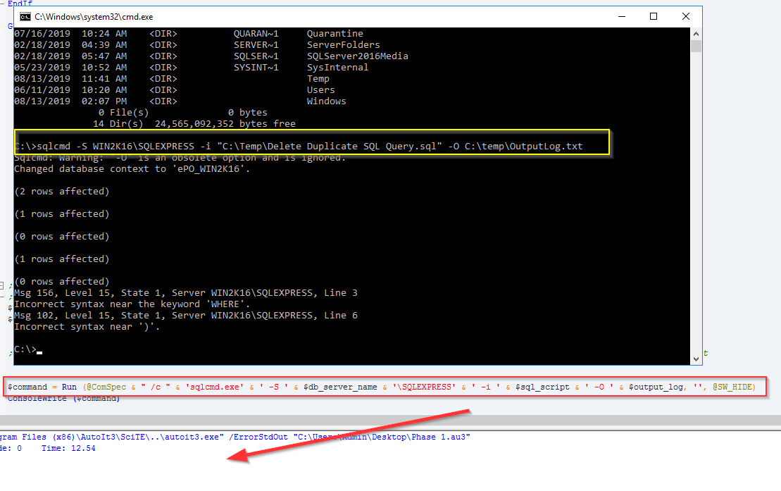 cesinha87 Posted August 14, 2019 Author Posted August 14, 2019 It looks like it's running part of the command.C:\Windows\system32\cmd.exe /k sqlcmd.exe -S WIN2K16 and it's supposed to run the entire command sqlcmd.exe -S WIN2K16\SQLEXPRESS -i "C:\Temp\Delete Duplicate SQL Query.sql" -O C:\Windows\System32\McAfeeLogs\SQL_Script_log.txt
