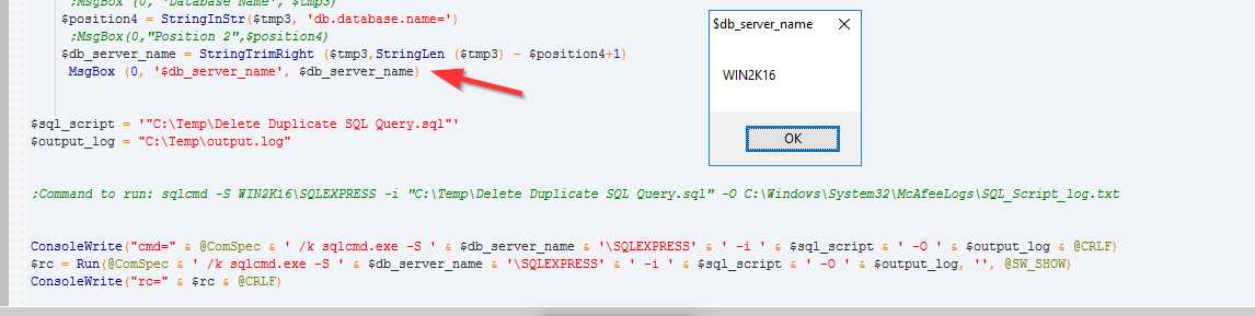 cesinha87 Posted August 14, 2019 Author Posted August 14, 2019 You are right sir, there some kind LF or CR in the $db_server_name variable and I am not able to find or figure out what's going on. When I run the following script: Same script as before without $db_server_name ConsoleWrite("cmd=" & @ComSpec & ' /k sqlcmd.exe -S ' & '\SQLEXPRESS' & ' -i ' & $sql_script & ' -O ' & $output_log & @CRLF) $rc = Run(@ComSpec & ' /k sqlcmd.exe -S ' & $db_server_name & '\SQLEXPRESS' & ' -i ' & $sql_script & ' -O ' & $output_log, '', @SW_SHOW) ConsoleWrite("rc=" & $rc & @CRLF) I get the right output Here is where I am getting the $db_server_name variable (Win2k16) Global $read = $file $read = FileRead($file) $trim1 = StringInStr($read, 'db.database.name=') $position1 = StringInStr($read, "db.database.name=") ;MsgBox(0,"",$position1) $tmp = StringTrimLeft ($read, $position1+16) ;MsgBox (0, 'Database Name', $tmp) $position2 = StringInStr($tmp, 'db.instance.name=') ;MsgBox(0,"Position 2",$position2) $db_name = StringTrimRight ($tmp,StringLen ($tmp) - $position2+1) ;MsgBox (0, 'Database Name', $db_name) $trim3 = StringInStr($read, 'db.server.name=') $position3 = StringInStr($read, "db.server.name=") ;MsgBox(0,"",$position1) $tmp3 = StringTrimLeft ($read, $position3+14) ;MsgBox (0, 'Database Name', $tmp3) $position4 = StringInStr($tmp3, 'db.database.name=') ;MsgBox(0,"Position 2",$position4) $db_server_name = StringTrimRight ($tmp3,StringLen ($tmp3) - $position4+1) MsgBox (0, '$db_server_name', $db_server_name) $sql_script = '"C:\Temp\Delete Duplicate SQL Query.sql"' $output_log = "C:\Temp\output.log" ;Command to run: sqlcmd -S WIN2K16\SQLEXPRESS -i "C:\Temp\Delete Duplicate SQL Query.sql" -O C:\Windows\System32\McAfeeLogs\SQL_Script_log.txt ConsoleWrite("cmd=" & @ComSpec & ' /k sqlcmd.exe -S ' & '\SQLEXPRESS' & ' -i ' & $sql_script & ' -O ' & $output_log & @CRLF) $rc = Run(@ComSpec & ' /k sqlcmd.exe -S ' & $db_server_name & '\SQLEXPRESS' & ' -i ' & $sql_script & ' -O ' & $output_log, '', @SW_SHOW) ConsoleWrite("rc=" & $rc & @CRLF)