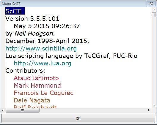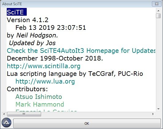 Developers Jos Posted October 15, 2019 Developers Posted October 15, 2019 (edited) I have no idea about this SciTE version: Show me a Cut&Paste of the top part of the Help/About SciTE info please. It for sure is not a recent version ...right? Jos Edited October 15, 2019 by Jos SciTE4AutoIt3 Full installer Download page - Beta files Read before posting How to post scriptsource Forum etiquette Forum Rules Live for the present, Dream of the future, Learn from the past.
