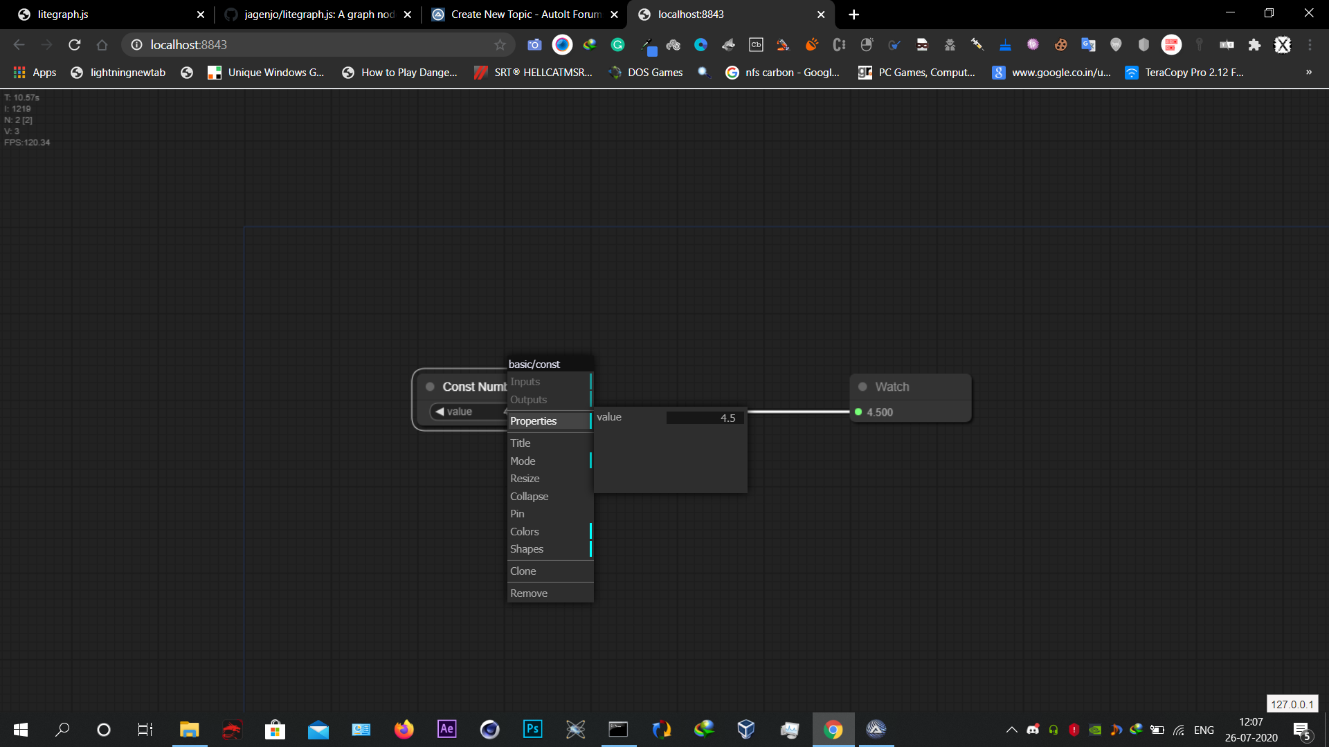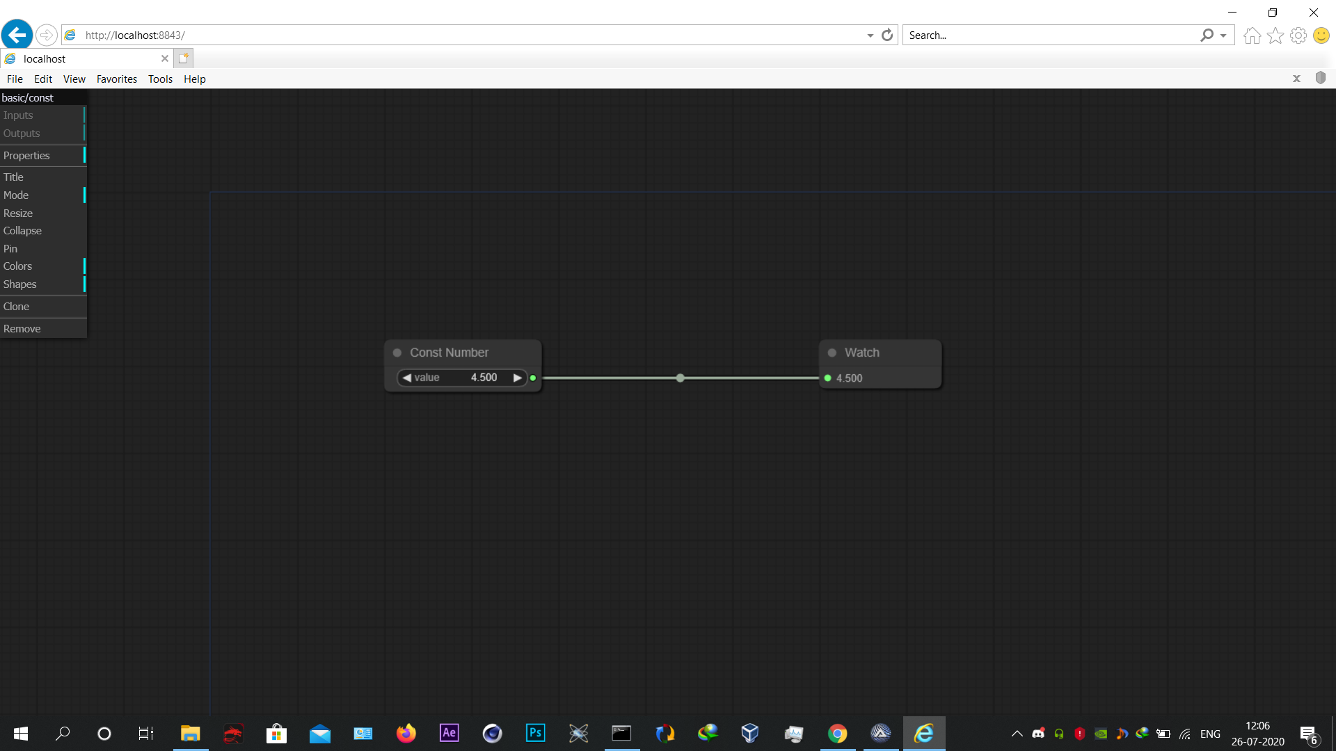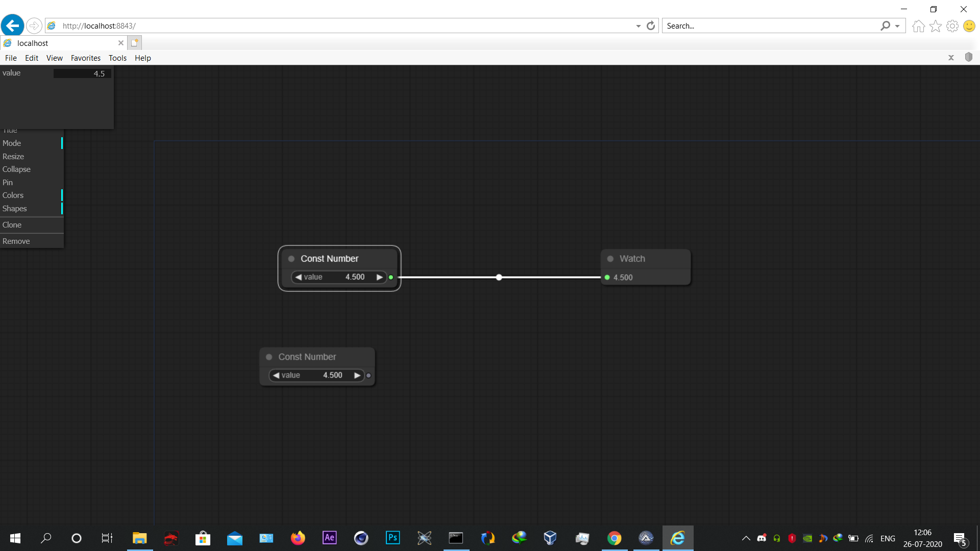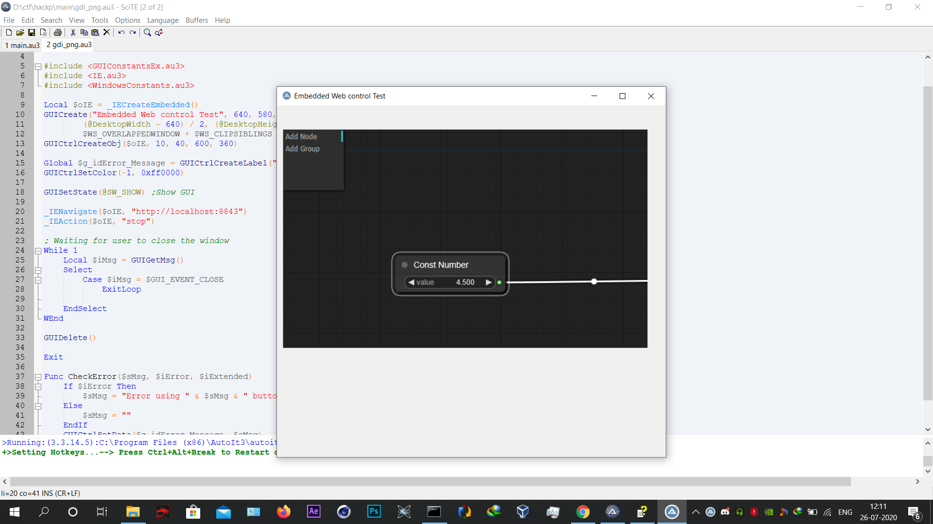 Surya Posted July 26, 2020 Posted July 26, 2020 Hi guys, I have been playin around with node editors a bit, mainly this litegraph by jagenjo ,but I cant run the demo on my Internet explorer,The problem is that when I right click on a Node the menu that appears goes to the top left and the graph doesnt respond the clicks in the menu ,This problem doesnt exist in google chrome though. Expected behaviour: The menu should appear where the user clicks and should respond to the clicks Showing behaviour: The menu appears at top left and doesnt respond when 'adding nodes' option is clicked Code I am using, expandcollapse popup; Trap COM errors so that 'Back' and 'Forward' ; outside of history bounds does not abort script ; (expect COM errors to be sent to the console) #include <GUIConstantsEx.au3> #include <IE.au3> #include <WindowsConstants.au3> Local $oIE = _IECreateEmbedded() GUICreate("Embedded Web control Test", 640, 580, _ (@DesktopWidth - 640) / 2, (@DesktopHeight - 580) / 2, _ $WS_OVERLAPPEDWINDOW + $WS_CLIPSIBLINGS + $WS_CLIPCHILDREN) GUICtrlCreateObj($oIE, 10, 40, 600, 360) Global $g_idError_Message = GUICtrlCreateLabel("", 100, 500, 500, 30) GUICtrlSetColor(-1, 0xff0000) GUISetState(@SW_SHOW) ;Show GUI _IENavigate($oIE, "http://localhost:8843") _IEAction($oIE, "stop") ; Waiting for user to close the window While 1 Local $iMsg = GUIGetMsg() Select Case $iMsg = $GUI_EVENT_CLOSE ExitLoop EndSelect WEnd GUIDelete() Exit Func CheckError($sMsg, $iError, $iExtended) If $iError Then $sMsg = "Error using " & $sMsg & " button (" & $iExtended & ")" Else $sMsg = "" EndIf GUICtrlSetData($g_idError_Message, $sMsg) EndFunc ;==>CheckError Attatched screenshots of whats happening. Is this a problem with IE as it works good in Chrome and firefox No matter whatever the challenge maybe control on the outcome its on you its always have been. MY UDF: Transpond UDF (Sent vriables to Programs) , Utter UDF (Speech Recognition)