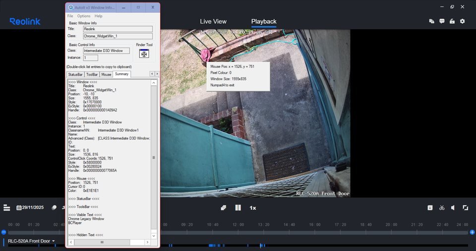 photonbuddy Posted 4 hours ago Posted 4 hours ago Hi All, I am writing a script to control the Reolink desktop client. My development machine is running Windows 10, while the target machine, our HTPC, is running Windows 11. I have just updated to the current release v3.3.18.0. The script works wonderfully on my development machine, but failed right from the first try on the HTPC. I then realised the colors were slightly different, so got the correct color codes from Au3Info, but I am still failing. [After writing a lengthy post, I realised there was 1 other difference between the 2 machines] I think I have found the problem. PixelGetColor uses different code than whatever Au3Info uses to get pixel color. PixelGetColor fails when running at a non-100% scaling. The attached image is a screenshot of the issue. The code to make the mouse box is: Func DoMouse() $mouse = MouseGetPos() $mgui = GUICreate("MouseTester", 200, 90, -1, 200, 0x80000000 + 0x00400000, 0x00000080 + 0x00000008) $MLoc = GUICtrlCreateLabel("Mouse Pos: x = " & $mouse[0] & ", y = " & $mouse[1], 10, 5, 180) $Pix = GUICtrlCreateLabel("Pixel Colour: " & Hex(PixelGetColor($mouse[0], $mouse[1])), 10, 25, 180) $WDim = GUICtrlCreateLabel("Window Size: " & $RLWinSize[2] & "x" & $RLWinSize[3], 10, 45, 180) GUICtrlCreateLabel("Numpad4 to exit", 10, 65, 180) GUISetState(@SW_SHOW) GUISetState(@SW_DISABLE) While 1 $mouse = MouseGetPos() Sleep(100) Select Case _IsPressed("67") ; = "{numpad7}" ;MsgBox(0, "", $nmsg) MouseMove($mouse[0] - 1, $mouse[1]) Case _IsPressed("69") ; = "{numpad9}" MouseMove($mouse[0] + 1, $mouse[1]) Case _IsPressed("68") ; = "{numpad8}" MouseMove($mouse[0], $mouse[1] - 1) Case _IsPressed("65") ; = "{numpad5}" MouseMove($mouse[0], $mouse[1] + 1) Case _IsPressed("64") ; = numpad4 ExitLoop EndSelect GUICtrlSetData($MLoc, "Mouse Pos: x = " & $mouse[0] & ", y = " & $mouse[1]) GUICtrlSetData($Pix, "Pixel Colour: " & PixelGetColor($mouse[0], $mouse[1])) WEnd GUIDelete($mgui) EndFunc ;==>DoMouse My perfectly running script on the development machine broke immediately when changing scale. AU3Info continued to return the correct colors. What do I replace PixelGetColor with so my code returns the same value as Au3Info?