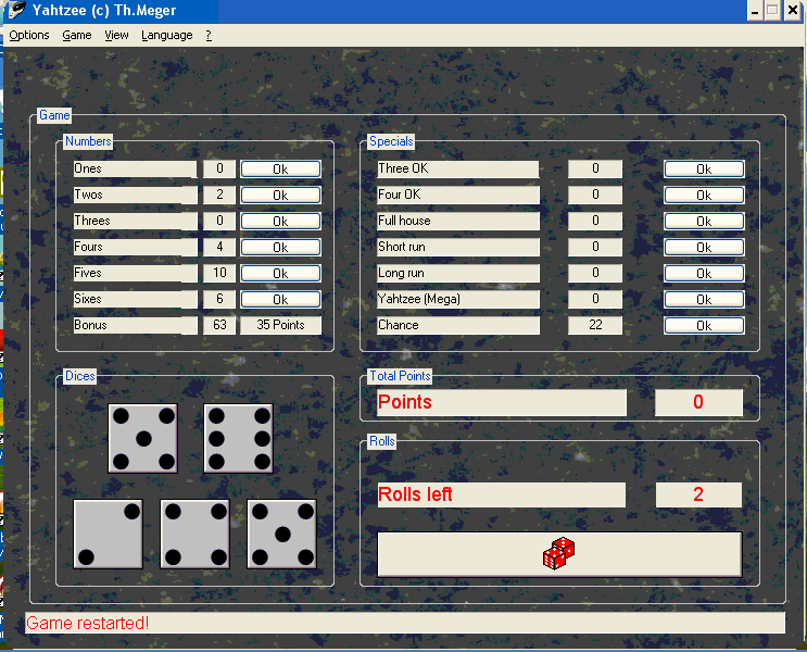 Valuater Posted December 27, 2007 Posted December 27, 2007 (edited) See attachment for a screenshot. I had just clicked on Restart before taking this image. I had just thought Restart would start a new game, throwing away all the old values. Clearly this is not the case....The screenshot you have appears correct to meIf you look at the dice there are - one 2, one 4, two 5, one 6 and that should look ike thisOnes = 0Twos = 2Threes = 0Fours = 4Fives = 10Sixes = 6All of the above "OK" buttons are available ( none are used )If you take "chance" that = 22Your total points are "0" I think Undo should be used for going back. For example, "I did not mean to put the score there; I meant over here." or "Oh why did I click roll? I actually had a small straight."I like that idea8) Edited December 27, 2007 by Valuater