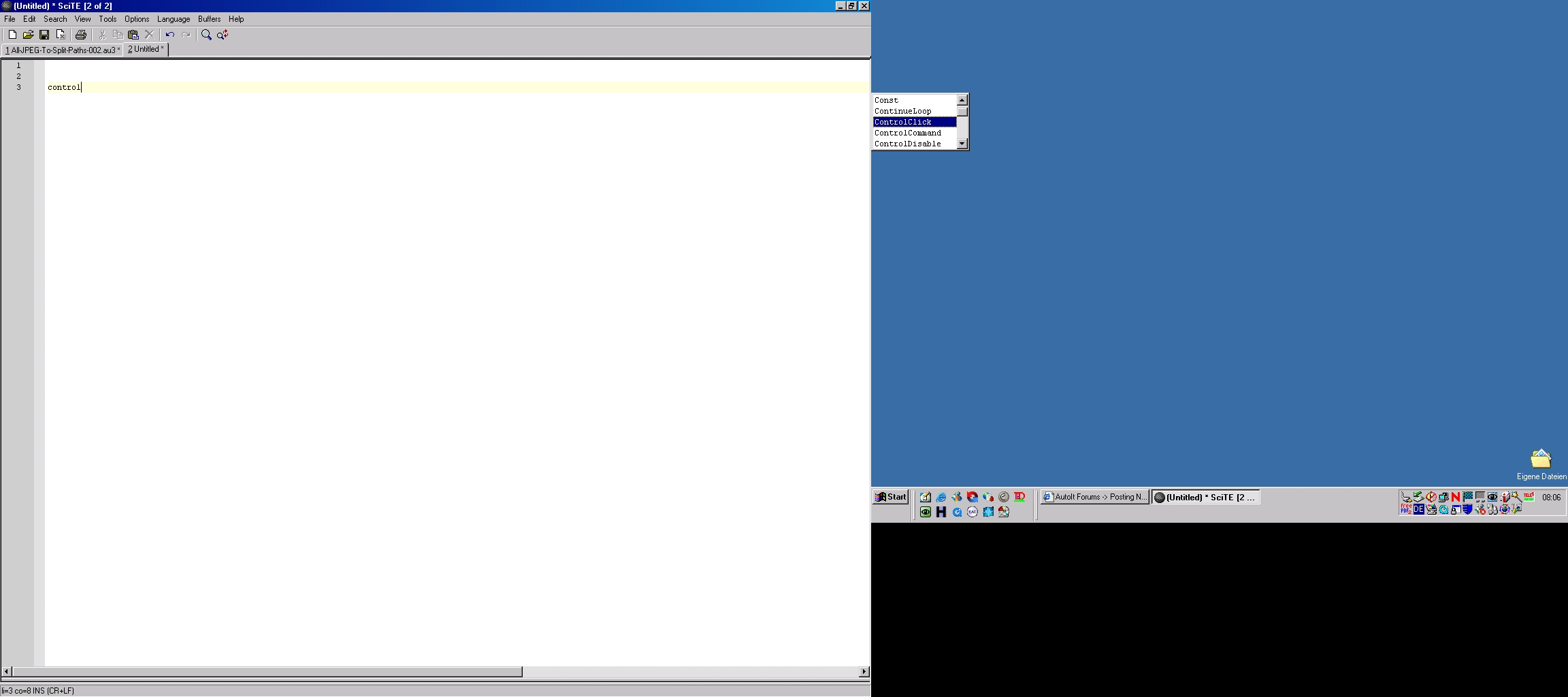 rudi Posted July 8, 2007 Posted July 8, 2007 Hello, when my Laptop is in it's port replicator [1], I prefer to use the larger, 2nd monitor to code in "AutoIT-SciTE", version 1.68. SciTE Window is maximized on the 2nd monitor: 1280*1024 (left) The Desktop is on the 1st monitor: 1024*768 (right) The autocomplete window opens on the 1st monitor, at the left margin in the pixel distance from top, where I'm typing in the maximized SciTE window on the 2nd monitor. So if I'm typing 'below' 768 pixels from top, it even opens 'outside' the 1st monitor. Can I change this, so that the autocomplete always opens just below the position I'm typing in the SciTE window? I try to attach a screenshot. Have a nice weekend, Rudi. [1] HP Omnibook XE3-GF, Windows 2000 SP4. Earth is flat, pigs can fly, and Nuclear Power is SAFE!