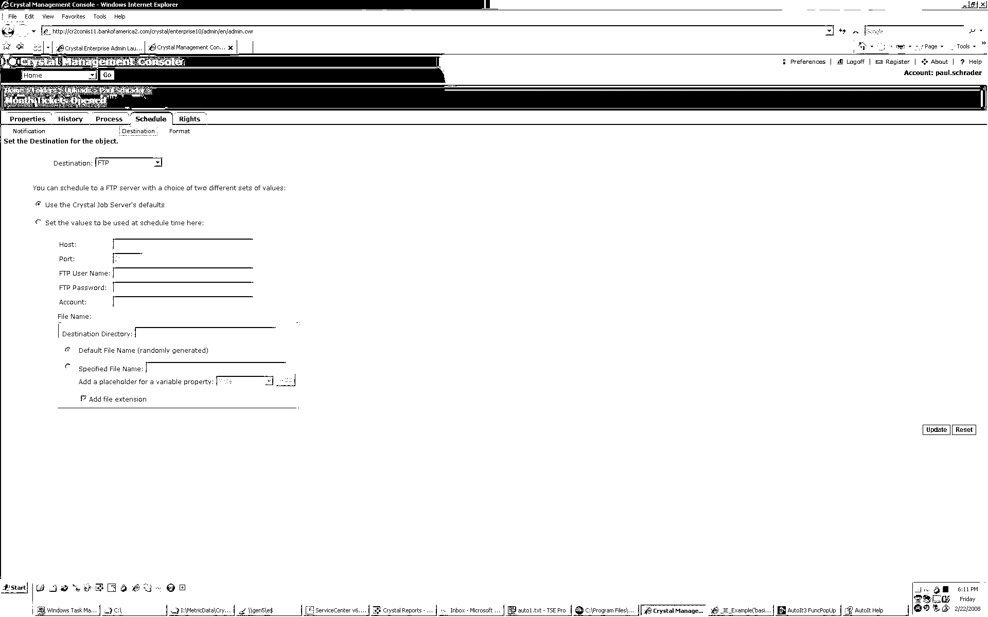 HighlanderSword Posted February 22, 2008 Posted February 22, 2008 Hello, I'm trying to control the Crystal Console using Autoit , the problem I'm running into is their doesnt appear to be any form that I can attach to to apss my commands to. I'm guessing its a Javascript deal., Listed Below is the Source Code when the Page is rendered in Ie I have alos attached a GIF that shows how the page looks when displayed in IE. How would I go about passing data to this ? Any help would be greatly appreciated. Paul <HTML> <HEAD> <LINK REL="stylesheet" TYPE="text/css" HREF="/crystal/enterprise10/admin/en/css/default.css"> <script language="Javascript"> //LOCALIZATION STRINGS var L_NOT_VALID_PORT_NUM = "The port value must be a whole number greater than zero."; var L_UNKNOWN = "Unknown"; var L_DIR_CANNOT_BE_EMPTY = "The destination directory cannot be empty."; var L_HOST_NAME_EMPTY = "The host name cannot be empty."; var L_FROM_EMPTY = "The From field cannot be empty."; var L_TO_EMPTY = "The To field cannot be empty."; </script> <script LANGUAGE="Javascript" SRC="/crystal/enterprise10/admin/en/js/FormChek.js"></SCRIPT> <script> var canEdit = true; var hasFileNames = false; function init() { var sel = 'ftp'; if(sel == "unknown") { option = new Option(L_UNKNOWN, sel, false, false); document.forms['destForm'].dest.options[document.forms['destForm'].dest.options.length] = option; } for(var i = 0; i < document.forms['destForm'].dest.options.length; ++i) { if(document.forms['destForm'].dest.options.value == sel) { document.forms['destForm'].dest.options.selected = true; break; } } // call the dest init function onDestInit(); } function changeDest(d) { document.location.replace("/crystal/enterprise10/admin/en/infoobject.cwr?action=-10005&cmd=dest&id=1641901" + "&dest=" + d); } function submitForm() { if (!canEdit) return; var dest = document.forms["destForm"].dest; if(dest.options[dest.selectedIndex].value == "unknown") { // don't submit the form return; } if(dest.options[dest.selectedIndex].value == "disk") { if (document.forms["destForm"].server_default.value != "true") { if(document.forms["destForm"].dir.value == "") { alert(L_DIR_CANNOT_BE_EMPTY); document.forms["destForm"].dir.focus(); return; } } } if(dest.options[dest.selectedIndex].value == "ftp") { if (document.forms["destForm"].server_default.value != "true") { if(document.forms["destForm"].host.value == "") { alert(L_HOST_NAME_EMPTY); document.forms["destForm"].host.focus(); return; } } var port = document.forms["destForm"].port; if(!isPositiveInteger(port.value)) { alert(L_NOT_VALID_PORT_NUM); port.focus(); port.select(); return; } } if(dest.options[dest.selectedIndex].value == "smtp") { if (document.forms["destForm"].server_default.value != "true") { if(document.forms["destForm"].sender.value == "") { alert(L_FROM_EMPTY); document.forms["destForm"].sender.focus(); return; } if(document.forms["destForm"].to.value == "") { alert(L_TO_EMPTY); document.forms["destForm"].to.focus(); return; } } } // if the function is there, call it if (hasFileNames) onsubmitHandleFilenameCheckboxes(); document.forms['destForm'].submit(); } function resetForm() { if (canEdit) document.location.replace("/crystal/enterprise10/admin/en/infoobject.cwr?action=-10005&cmd=dest&id=1641901"); } function addProperty() { var prop = document.forms['destForm'].props.options[document.forms['destForm'].props.selectedIndex].value; document.forms['destForm'].specname.value = document.forms['destForm'].specname.value + prop; document.forms['destForm'].specname.focus(); } function addLink() { var prop = "%SI_VIEWER_URL%"; document.forms['destForm'].msg.value = document.forms['destForm'].msg.value + "\n" + prop; document.forms['destForm'].msg.focus(); } </SCRIPT> </HEAD> <BODY LEFTMARGIN="5" RIGHTMARGIN="5" onload='init()'> <DIV ID="tooltip" STYLE="position:absolute;visibility:hidden;z-index:99;"></DIV> <script SRC="/crystal/enterprise10/admin/en/js/helps.js"></SCRIPT> <script SRC="/crystal/enterprise10/admin/en/js/tips.js"></SCRIPT> <span class='listSelected'>Set the Destination for the object.</span><br> <p> <center> <form name='destForm' method=POST action='/crystal/enterprise10/admin/en/infoobject.cwr?action=-10005&cmd=set_dest&id=1641901'> <table width='90%'> <tr><td class='list'> </td></tr> <tr><td class='list'> Destination: <select name='dest' class='menuFormElement' onchange='changeDest(this.options[this.selectedIndex].value);' > <option value='frs' selected>Default <option value='disk'>Unmanaged Disk <option value='ftp'>FTP <option value='smtp'>Email (SMTP) </select> </td></tr> </table> <p> <script language="Javascript"> // All Destinations will have this function function onDestInit() { if (document.destForm.ftp_radio[0].defaultChecked) { onSetDisabled(true) } else { onSetFilename(); } } function onSetDisabled(test) { if (test == true) { document.destForm.host.disabled = true; document.destForm.port.disabled = true; document.destForm.user.disabled = true; document.destForm.password.disabled = true; document.destForm.account.disabled = true; document.destForm.dir.disabled = true; onSetFilenameDisabled( true ); document.destForm.server_default.value = true; } else { document.destForm.host.disabled = false; document.destForm.port.disabled = false; document.destForm.user.disabled = false; document.destForm.password.disabled = false; document.destForm.account.disabled = false; document.destForm.dir.disabled = false; onSetFilenameDisabled( false ); document.destForm.server_default.value = false; } } </script> <table width='95%' cellpadding=5 cellspacing=5> <tr><td class='list' colspan=2> You can schedule to a FTP server with a choice of two different sets of values: </td></tr> <tr> <td class='list' colspan=2> <input type="radio" name="ftp_radio" CHECKED onclick="java script:onSetDisabled(true);" > Use the Crystal Job Server's defaults </td> </tr> <tr> <td class='list' colspan=2> <input type="radio" name="ftp_radio" onclick="java script:onSetDisabled(false);" > Set the values to be 