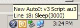 HockeyFan Posted March 24, 2008 Author Posted March 24, 2008 If I use this code: #include <GUIConstants.au3> #include <Date.au3> AutoItSetOption("TrayIconDebug", 1);0-off Opt("RunErrorsFatal", 0) ;1=fatal, 0=silent set @error Sleep(3000) I see the below (attached image) It shows where my code is at while it is running... (Line 18: Sleep(3000)) Very interesting....I've now run my script on a couple of other PC's and it works fine. There must be something odd about the machine I am using for testing. Thanks for you help!