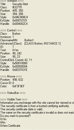 Misteredr Posted June 6, 2008 Author Posted June 6, 2008 I know I've had trouble with Java dialogs in the past... Try specifying only the controlID and no text: ControlClick("Security Alert","",1) Is the controlID for the Yes button really 1? Yea looks like it . Here is a screen shot. control_ID.bmp