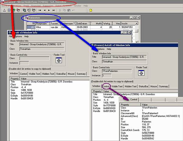 dgr Posted April 19, 2009 Posted April 19, 2009 (edited) Hello, Beiing a complete dutch newbie in AutoIT I'm looking for a solution for my problem over two days now. Tried a lot of things using topics in this forum and from the AutoIt-helpfile but unfortionally still not succeeded to solve the problem. I hope someone can and will help.... In the application I will automate with AutoIT there is a main window called "Intramed - Skrep Kinderfysio (728956) - G.R.Dorenbos" Using the function Winactive I can very well in AutoIT detect if the main window is activated or not and perform the things I want based on that detection. There is a sub-window under the main window in the application called "Patienten" which has, when using the AutoIT-Window-Info-tool, the same Title and Class as the main window "Intramed - Skrep Kinderfysio (728956) - G.R.Dorenbos" - "TIntraMain". The difference is visible in the Basic Control Info of the sub-window which reads "Class: TFormPatienten" and "Instance: 1". See also the attached picture. I've tried everything I could think of to determine the presence of the sub-window but I did not succeed in making AutoIt recognise that window. Using WinTitleMatchMode was no succes even as the advanced window descriptions.. I could't find any hint in the doc to include the basic control info into the Winactive-function or another solution, but maybe I overlooked? Can anybody help me out? Many thanks in advance! Edited April 19, 2009 by dgr